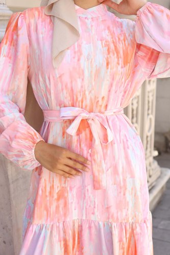 • Desenli Uzun Tesettür Elbise 2586 Pembe