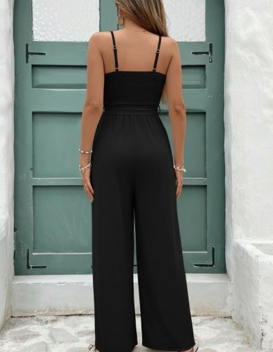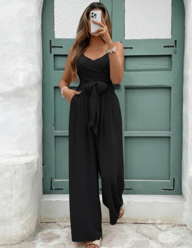 • Kadın ip askılı v yakalı belden kuşaklı uzun aerobin tulum