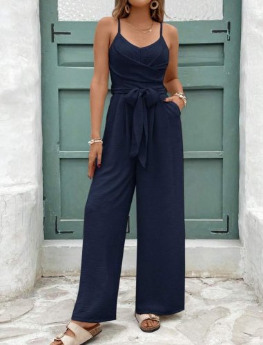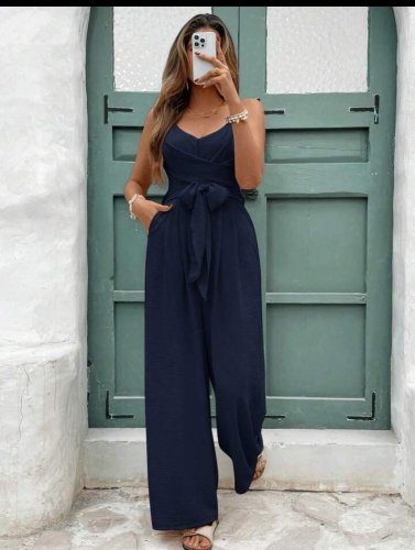 • Kadın ip askılı v yakalı belden kuşaklı uzun aerobin tulum